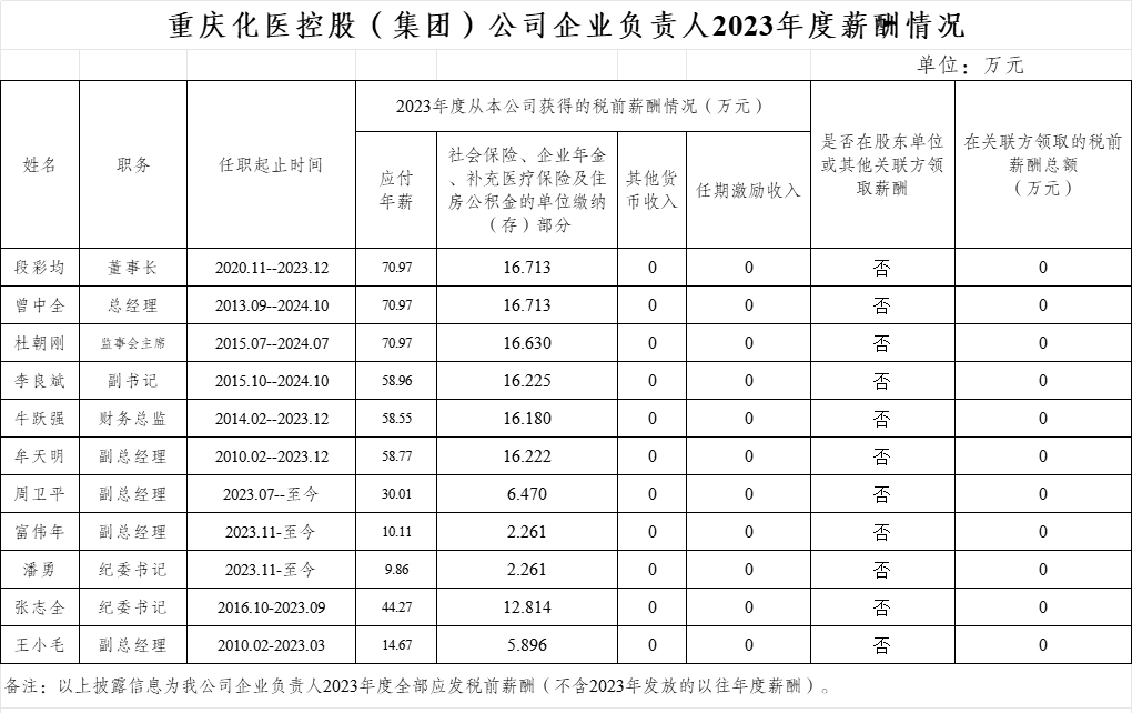 重慶化醫(yī)控股(集團(tuán))公司企業(yè)負(fù)責(zé)人2023年度薪酬情況