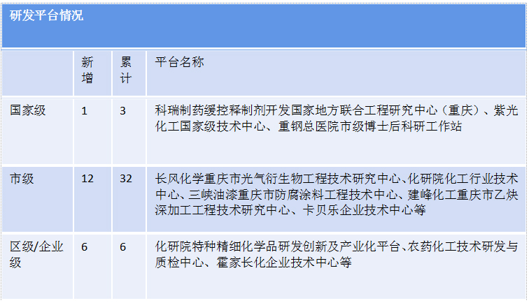 集團(tuán)企業(yè)擁有國家技術(shù)創(chuàng)新示范企業(yè)1個,為重慶紫光化工股份有限公司;國家高新級技術(shù)企業(yè)13個,其中醫(yī)藥板塊包括科瑞制藥、和平制藥等4個,化工板塊包括弛源化工、三峽油漆、化工研究院等9個。